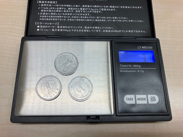写真のように 1円玉3枚分 とほぼ同じ重さなんです。
